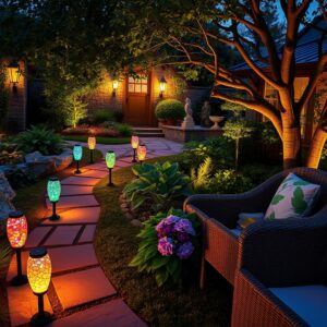 Transform your outdoor space with eco-chic garden lighting. Discover solar-powered lights, mosaic stakes, and LED spotlights for a vibrant, secure oasis.