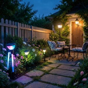Balance this glow with inviting seating—cushioned wicker chairs and rustic wooden benches that encourage lingering under the stars. Fairy garden décor adds that final sprinkle of charm, as if woodland sprites might appear at any moment. Surround these with lush greenery and seasonal blooms—lavender’s calming scent, ferns’ soft fronds, marigolds’ bright bursts—all chosen to harmonize with your lighting and deepen the enchanted vibe.