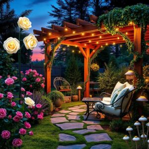 Picture this: soft blue highlights dapple the seat and spill onto nearby petals, casting a gentle radiance that transforms every evening into a cozy hideaway. The faint light on leaves feels almost musical—whispering secrets as the breeze moves through. Add a plush cushion, maybe a knit throw, and let the interplay of gentle glows and cool foliage wrap your senses. Whether hosting a midnight chat or simply enjoying the quiet, you’ve crafted pockets of magic where anyone can pause, breathe, and dream.