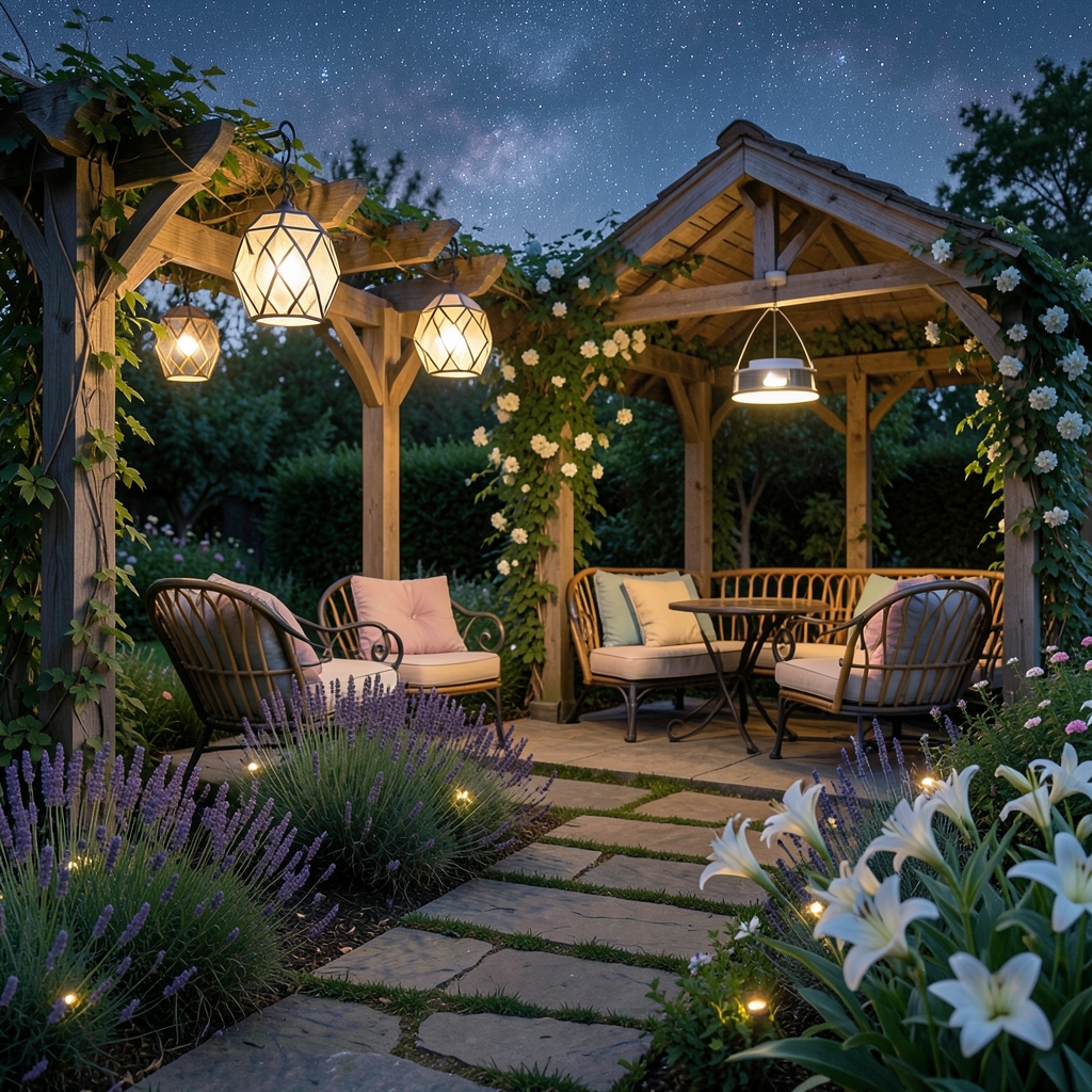 Picture a pergola bathed in a warm, octagonal pendant light, its geometric shadows casting graceful patterns on bamboo chairs draped with pastel cushions. These delicate pools of light transform seating and dining spaces into cozy retreats perfect for slow, quiet evenings or gentle conversations with friends. The subtle interplay of classic wrought iron or natural materials with soft illumination paints your garden as a place where form meets comfort. Whether you’re leisurely reading or sharing a meal, the ambient glow invites you to linger, turning ordinary moments into timeless memories under an enchanted sky.