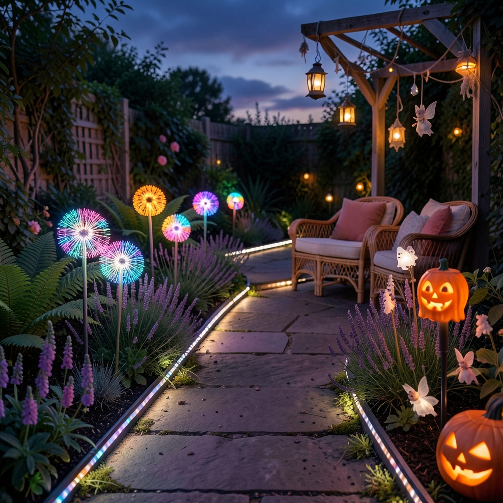 Picture your garden as a stage where every light plays a role. Color-changing stakes create lively accents, like dancing spots of color guiding you down the path. Pair these with soft, steady LED strip lights woven along edges or railings, casting a subtle glow that pulls the scene together. Use seasonal lights—a few glowing pumpkins here, a quiet ghostly shimmer there—as pockets of surprise, not the main act. The idea is to layer your lighting: some spots for function, others for decoration. This balance keeps your garden’s magic alive and flowing, never overwhelming, always inviting.