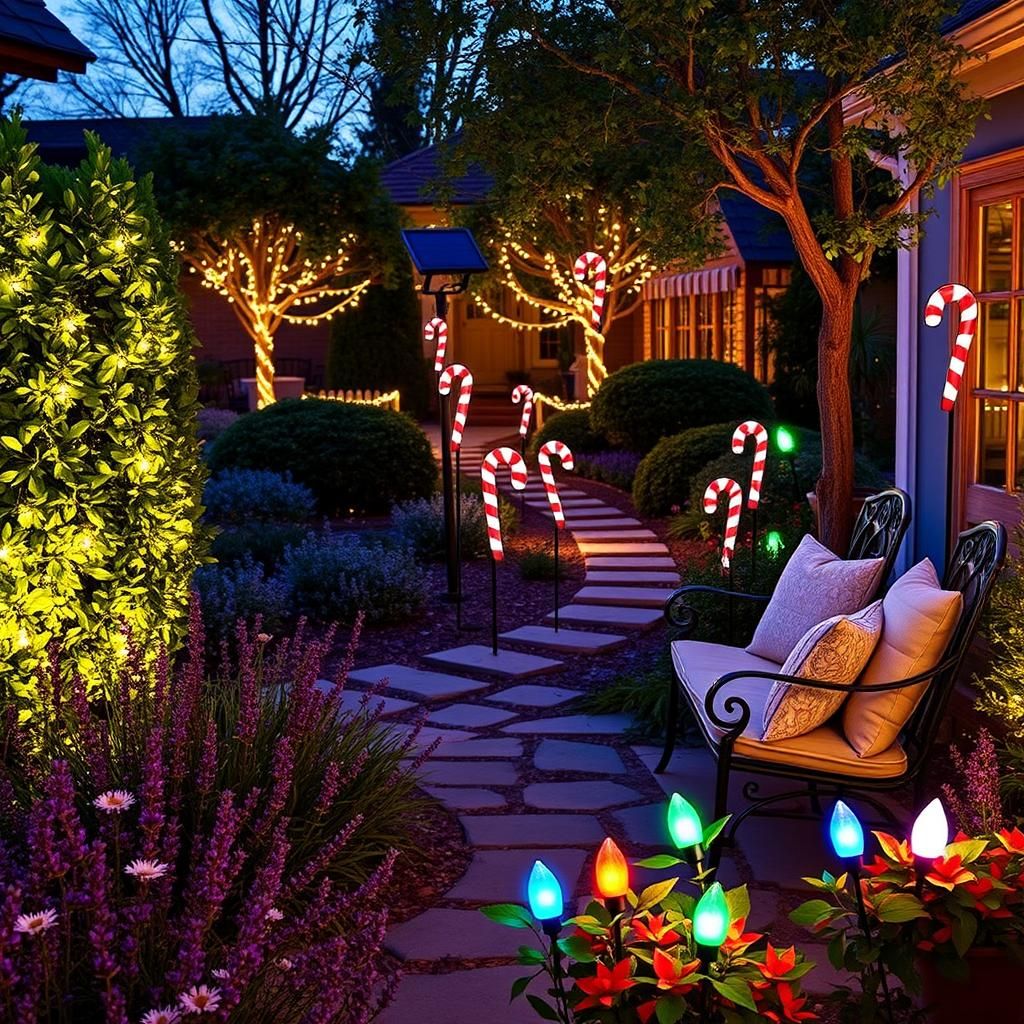 Guide wandering feet with festive stakes molded into candy canes, lining your paths and flower bed edges like gentle sentinels. They’re not just decorations, but a warm invitation to explore your garden’s secret corners. Space them thoughtfully, so their glow weaves a delicate trail, sparking curiosity and delight as evening falls.