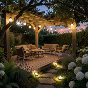 Think simple, natural, and inviting. Choose furniture crafted from rattan or wicker—materials that blend effortlessly with garden surroundings while offering a relaxed, timeless look. Slip on cushions in soft, neutral shades to keep things calm and cozy, letting the natural textures do the talking. Toss in a few throw pillows in earthy tones or gentle pastels, the kind that feel like a soft breeze brushing by. Arrange your seating so it encourages lingering—whether it’s a quiet corner for reading or a circle for easy conversation. The goal? Comfort that feels effortless, matching the gentle glow of your garden lights.