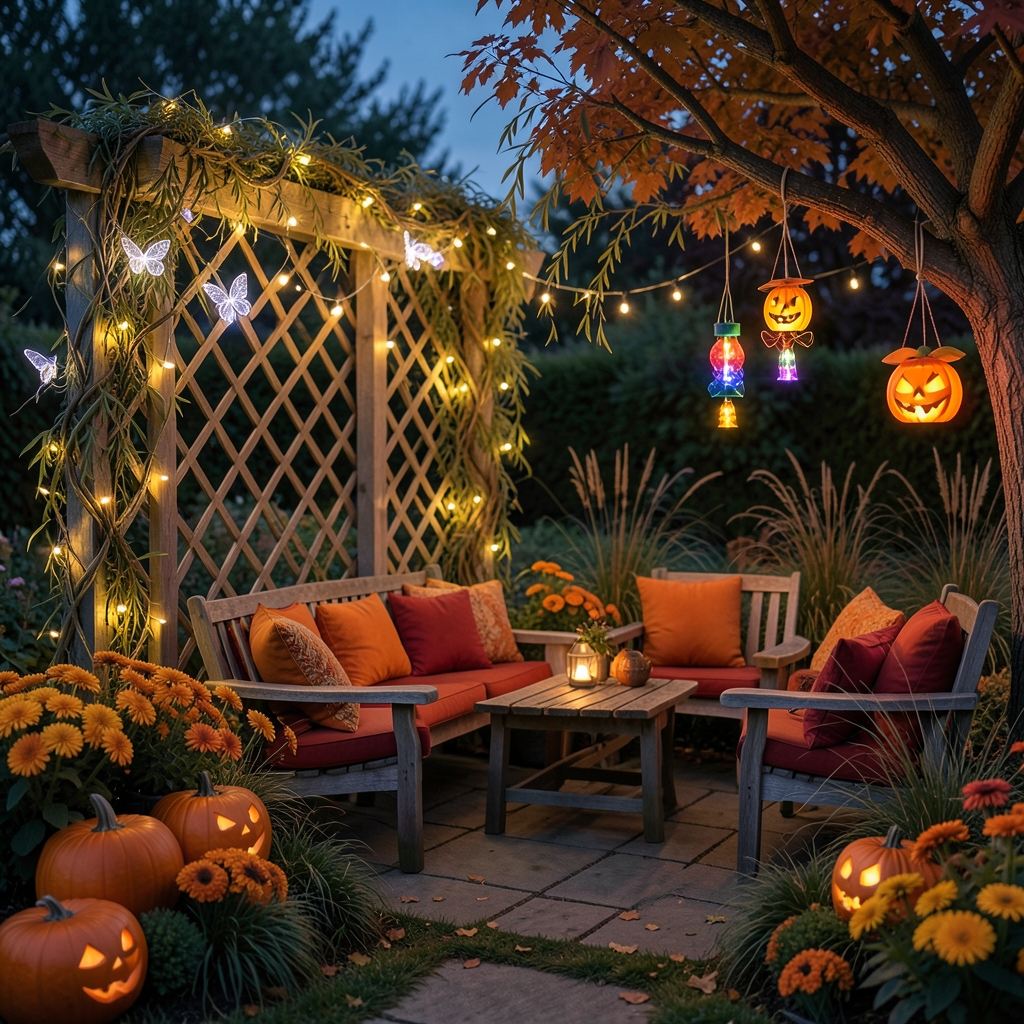 Hang solar-powered wind chimes adorned with glowing pumpkin motifs from tree branches or porch eaves. When the breeze stirs, these charms come alive with tiny lights and soft chimes, wrapping the space in a sensory embrace of sight and sound. Paired with cozy cushions in rich autumn hues, these spots beckon you to linger longer, enjoying the gentle dance of light and music under the crisp fall sky. Here, every little movement feels like a whisper from the garden itself—alive, playful, and inviting.