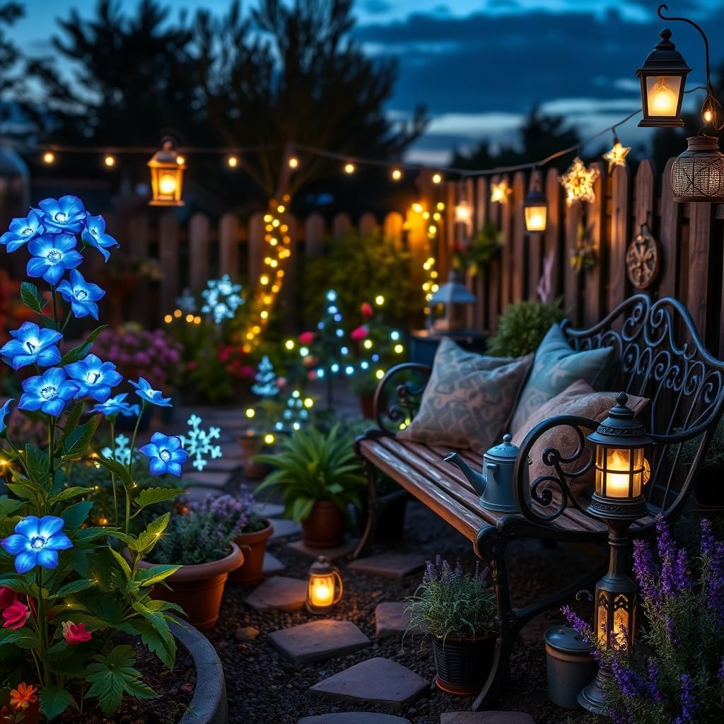 Imagine stepping into a garden where every corner tells a story. To craft this enchanting retreat, start by layering your lights thoughtfully: floral, starry, and vintage hues blending like brushstrokes on a twilight canvas. Position your floral lights close to actual blooms—let their gentle glow deepen petal colors and invite hummingbirds at dusk. Star-shaped stake lights aren’t just decoration; they trace pathways like constellations guiding your way through the night. Vintage-style solar lamps perched on benches or nestled among ferns whisper stories of bygone days, adding warmth and character.