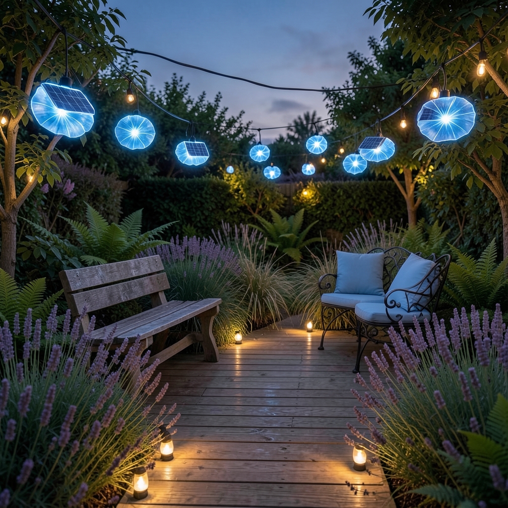 Paths and deck edges are the veins of your garden’s nighttime magic. Soft, warm solar deck lights delicately mark these boundaries, guiding footsteps gently without stealing the show from your blue floral highlights. By lining walkways and steps with these glowing guardians, you craft a safe, inviting journey through your outdoor retreat. It’s subtle, it’s practical—and it ensures the path feels like part of the enchantment, not just a way to get from one point to another.