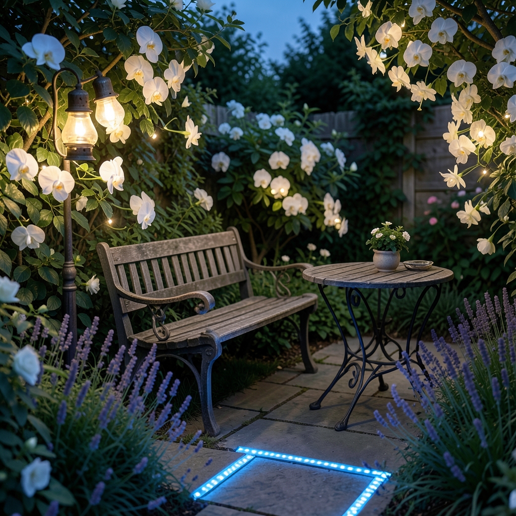 Paths lined with subtle blue lights create a gentle guide through your garden’s secrets. Small solar reflectors spaced evenly lead the way, their cool hue contrasting beautifully with the warmth of other lights. They don’t shout for attention but softly mark the trail, ensuring safe footsteps and adding a dreamy, serene mood. It’s like following a quiet stream of starlight, every step inviting you deeper into the heart of your enchanting vintage haven.