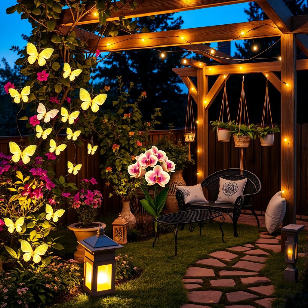 Picture your friends settling into cozy seating, bathed in a soft glow that feels like a warm embrace. Arrange chairs and benches to face the garden’s illuminated focal points—maybe a glowing orchid lamp or a twinkling butterfly light nestling among leaves. Let gentle sounds drift in, whether from a distant fountain or subtle music played low, wrapping the senses in calm delight. Simple touches, like lanterns flashing softly on tables or draped fairy lights overhead, create a feeling that time has slowed, making every glance and conversation more intimate and relaxed.