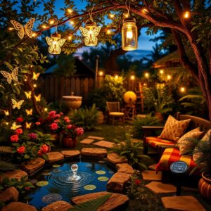 Create a magical garden lighting setup with solar string lights and whimsical decor for a cozy, enchanting outdoor retreat.